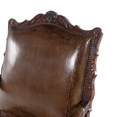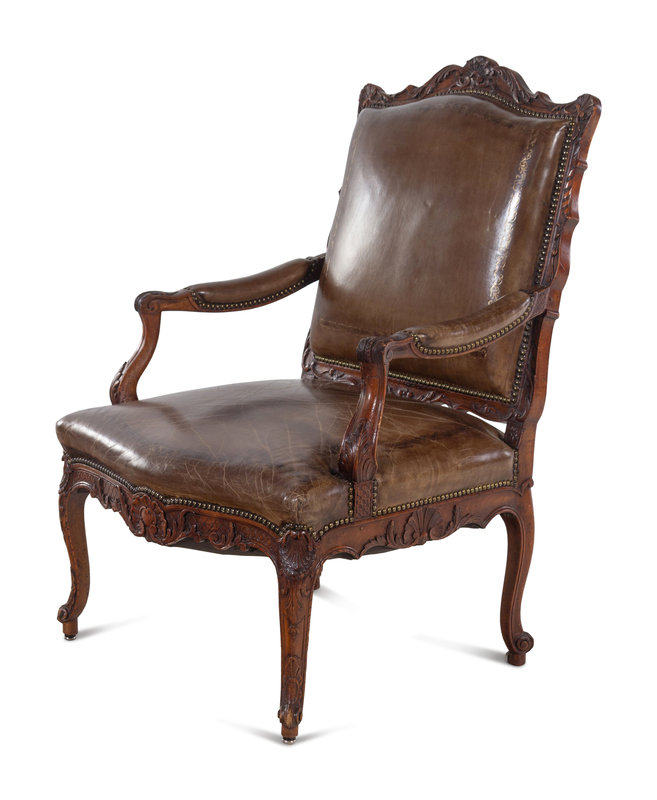A Régence Style Carved Walnut Fauteuil with Leather Upholstery