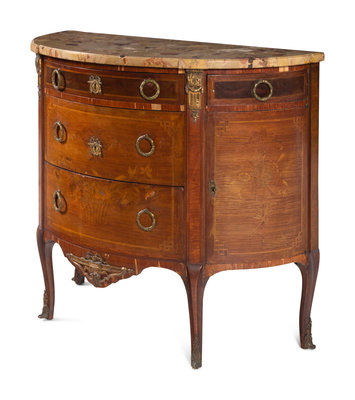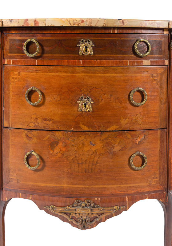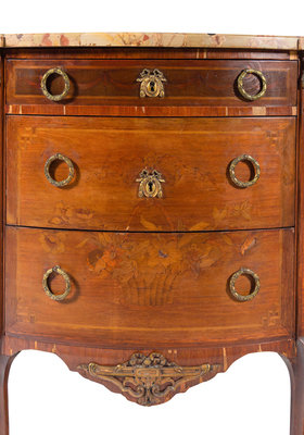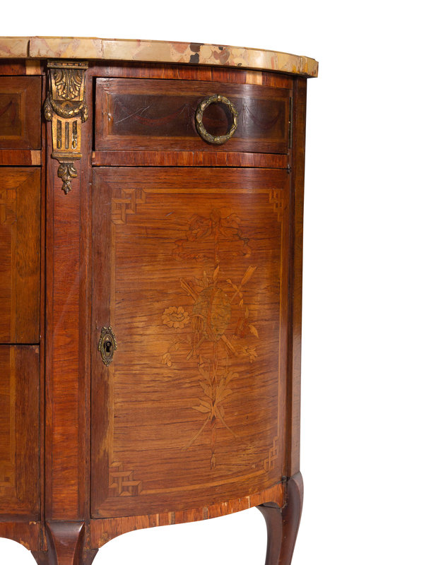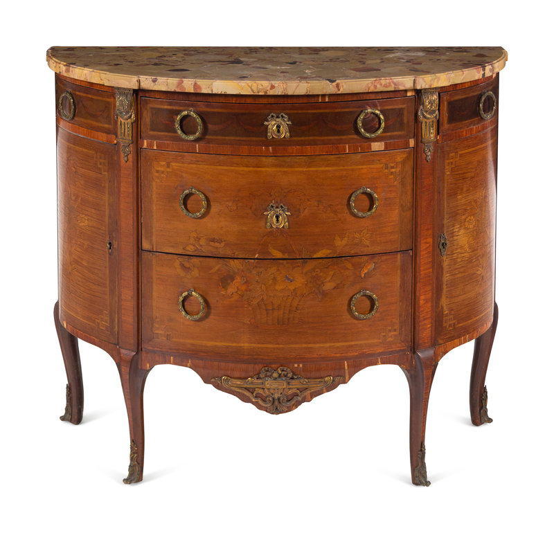 A Louis XV/XVI Transitional Style Marquetry Marble-Top Commode