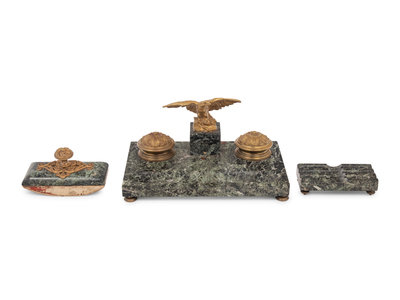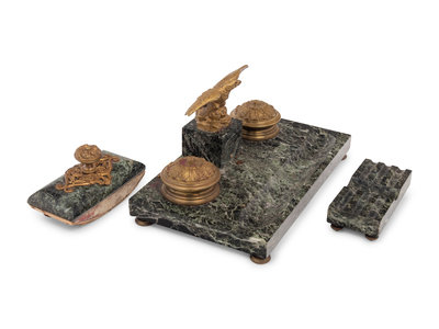 comprising an ink stand, blotter and pen holder, together with an associated leather-inset writing pad.