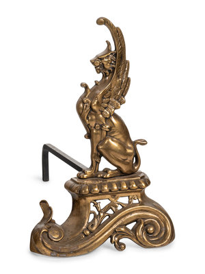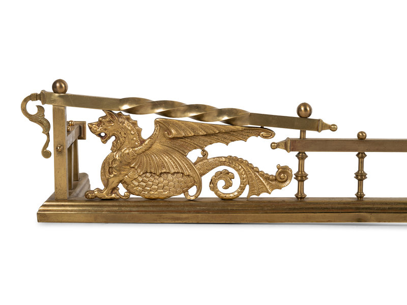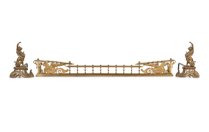 A Neoclassical Style Brass Fire Fender and Chenets with Griffins