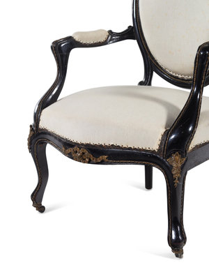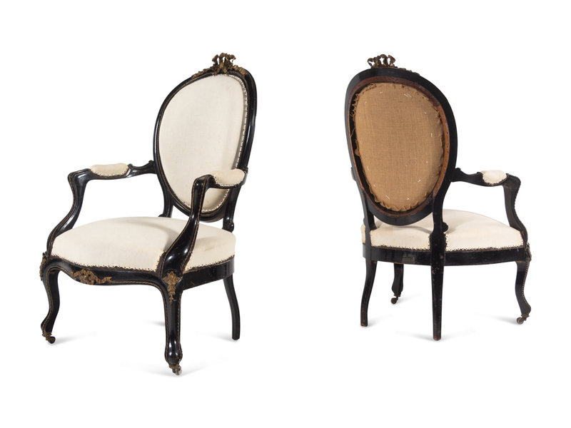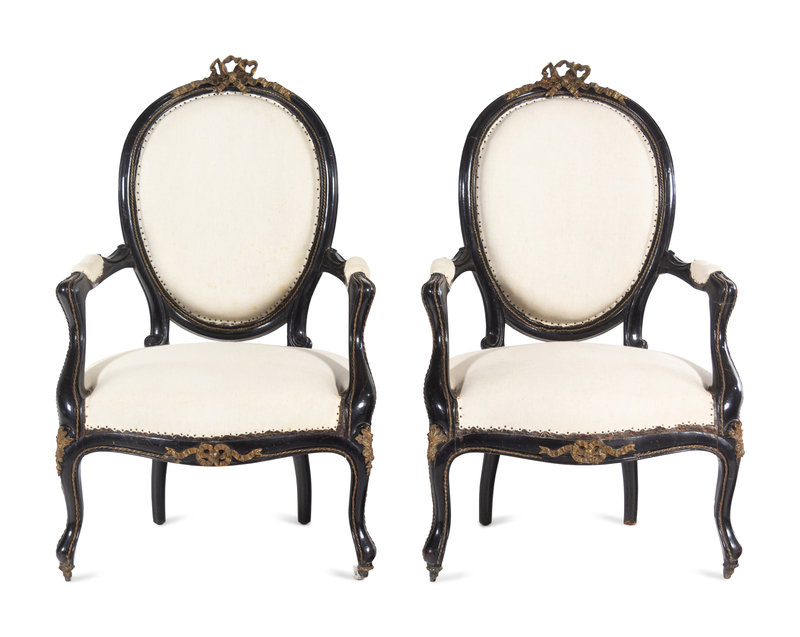 A Pair of Napoleon III Gilt Metal Mounted Ebonized Fauteuils