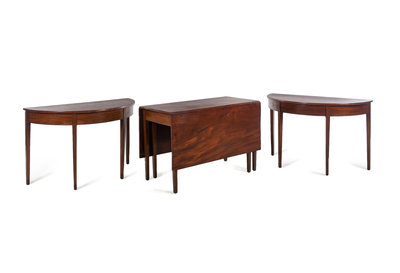 comprising a drop-leaf center table and two demilune end tables.