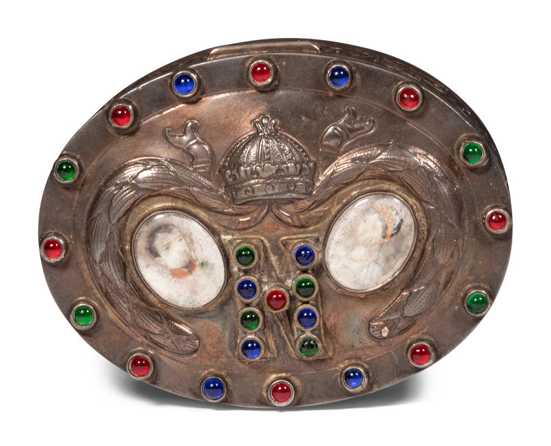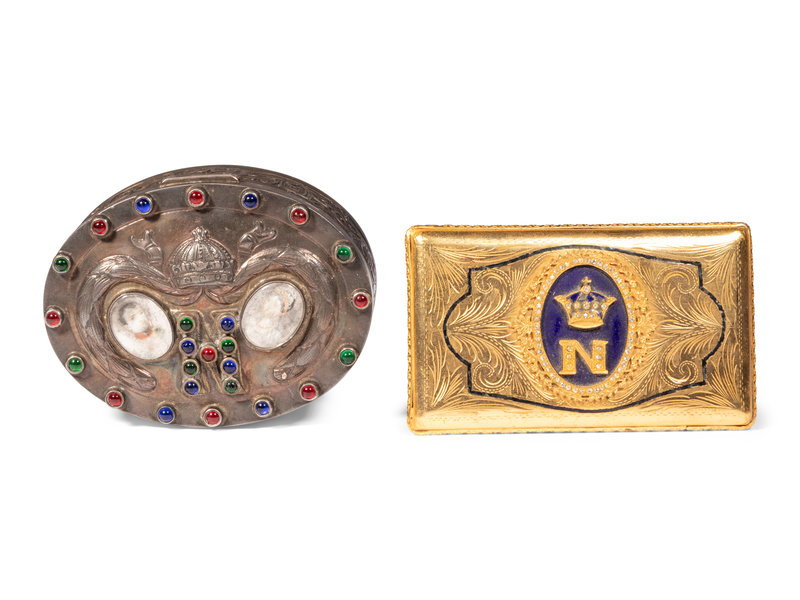 comprising a silver box with inset hand-painted portraits of Napoleon and Josephine and red, blue and green paste gems, bearing a London import mark and an Edwin Thomas Bryant, London maker's mark, further marked 925 to the cover and 930 to the underside; a rhinestone inset gilt metal box stamped Made in Italy to the interior and a bronze and patinated metal table casket.