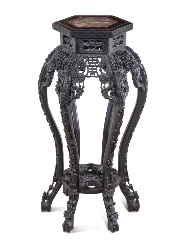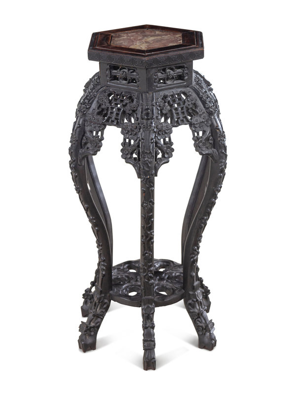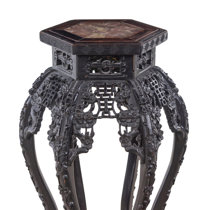 A Chinese Carved Hardwood and Marble-Inset Pedestal Table