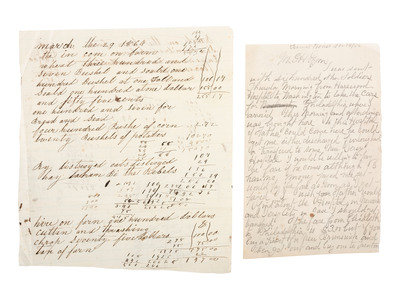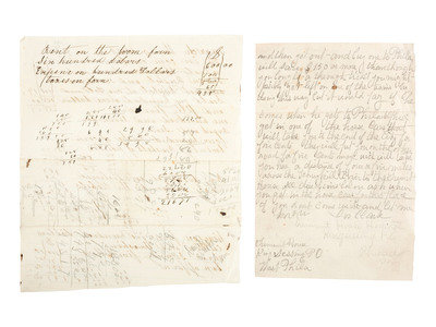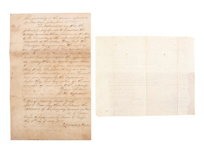 Last will and wishes of F. Tilghman Sr. Feb. 12, 1845. 1pg., 7-3/4 x 9-3/4 in. Mr. Tilghman indicates “I wish the following instructions to be strictly adhered to – 1st – My friends will have me dressed in a full sit of cloth clothes “shirt, stockings, drawrs, pantaloons, vest, coat, collar & stock(?)” / 2nd not to bury me is less than 72 hours after my death - + 3rd My coffin to be lined on the inside with flannel & on the outside with black cloth – 4th Prince to be immediately set Free and my other slaves to serve as long as my wife may direct. 5th- All my property of every description to go to my wife to be disposed of as she may think proper.” Along the side “To be buried [missing] the Episcopal burying ground.” On verso: "To be read immediately after my Death."