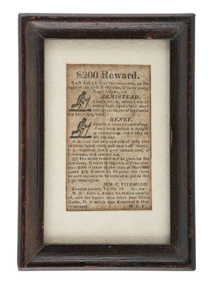Newspaper clipping, framed: $200 Reward. Ran Away from the subscriber, on the night of the 15th of October, 2 likely young Negro fellows, viz. Armistead, a black fellow, about 5 feet 10 inches high, square built, short hair, a scar on one of his cheeks and has a long head. Henry, a youth of about 18 years of age, of very brisk motion & sprightly countenance, and is very easily alarmed…”