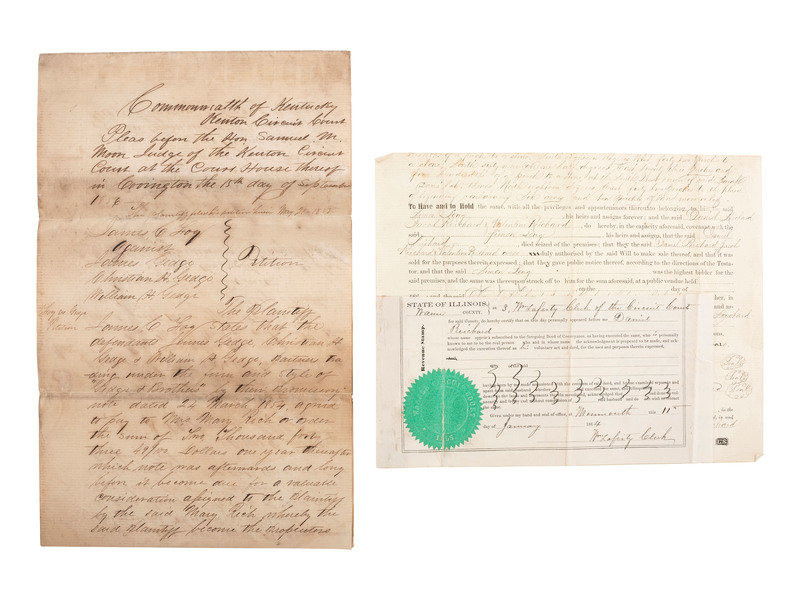 Legal document, Commonwealth of Kentucky, Kenton Circuit Court, 15 Sept. 1856. 4pp, 7-3/4 x 12-1/4 in. Concerning money owed by James Gedge, Christian Gedge and William Gedge (“Gedge & Brothers”) to Mary Rich ($2043.49). (areas of darkening to various degrees; surface soil)