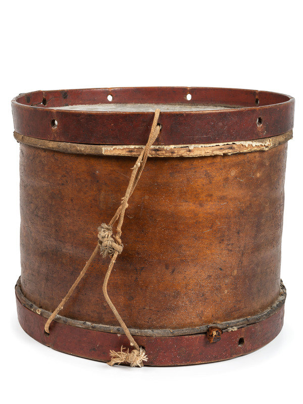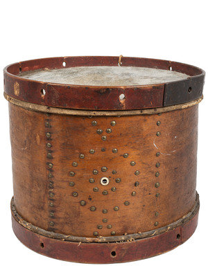 Brown wood body with brass tacks forming geometric patterns. Top and bottom counterhoops painted red. 14 3/8 in. dia. 11 7/8 in. height. Paper label on inside of drum reads, " Premium Bass and Snare / Drums, / Tambourine & Banjos, / Made and Repaired by / George Kilbourn, / 119 Orange Street, / Albany, N.Y." and numbered "3244" below label. Handwritten identification on drum interior "John W. France / Olivesburg, Richland / County, Ohio."
