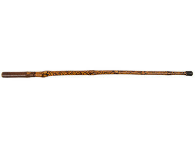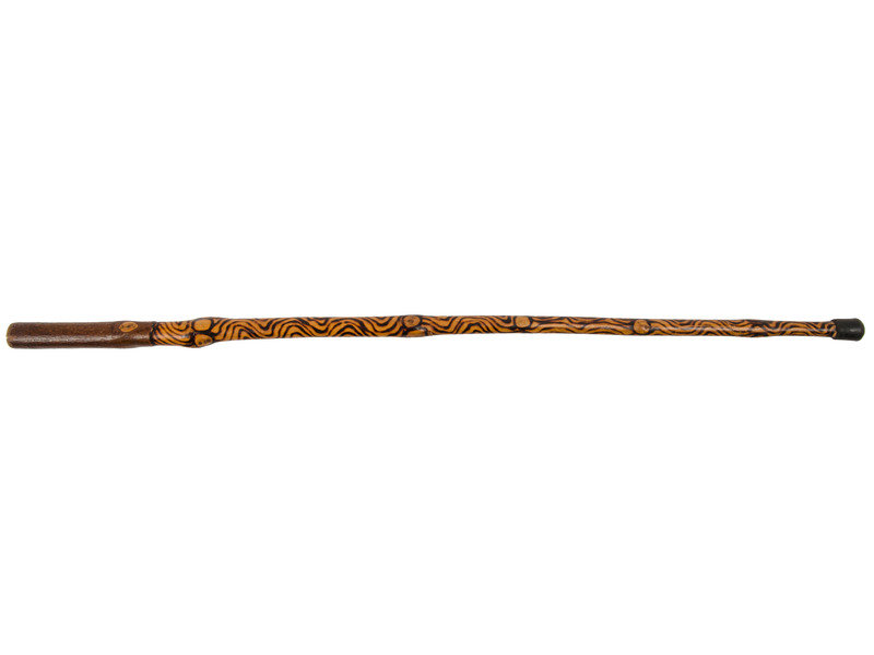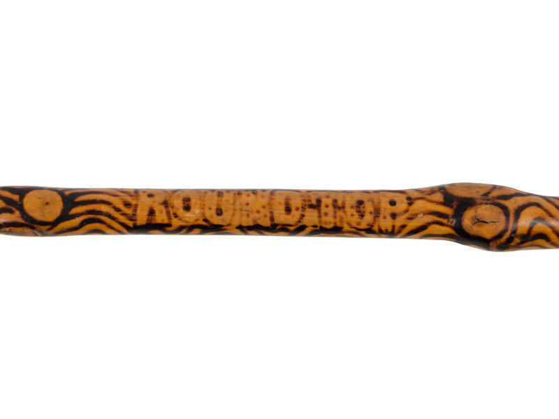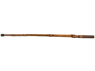 34 in. ln. souvenir cane made from a single American hardwood with all over geometric pyro decoration, and "Round Top" pyro inscription near top of shaft. With rubber stopper.