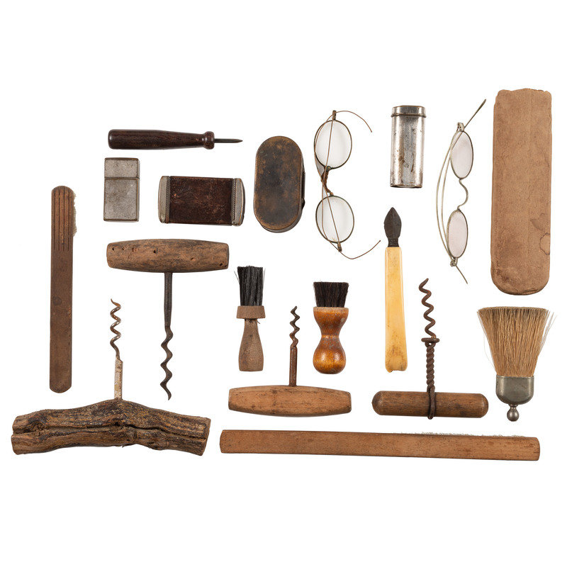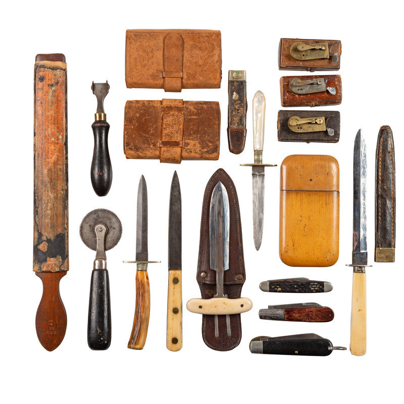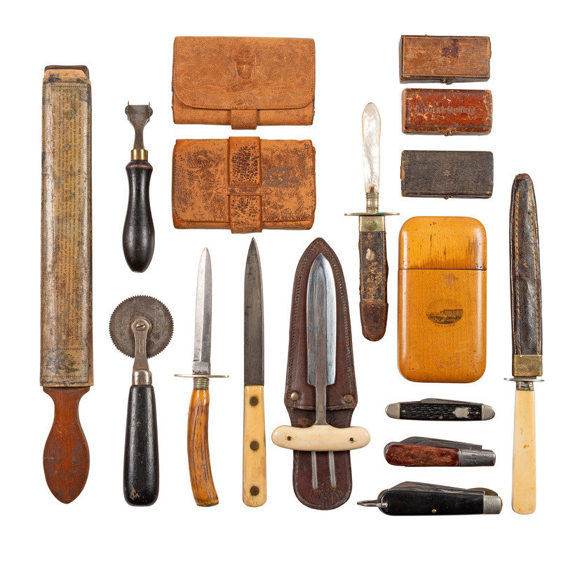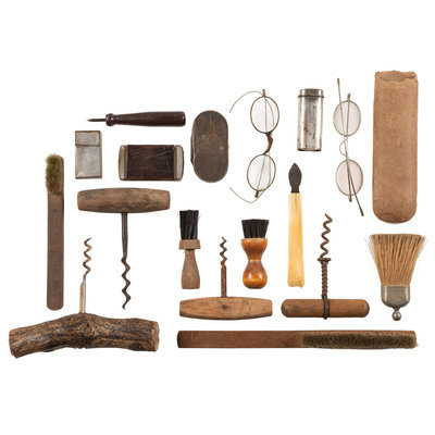 2 leather wallets. -- Wood case, 2 1/2 x 5 in. with leather collar around the inside and Pensarn on front. -- 3 fleems. -- 2 pocket sewing kits (Lydia Pinkham's).-- Leather strop. -- 3 pocket knives, a push dagger with bone handle. -- 4 1/2 in. single-edged knife with a bone handle. -- 4 in. double-edged knife with antler handle. -- 6 in. double-edged knife with a bone handle. --3 3/4 in. double-edged knife with mother-of-pearl handle. --Draw knife with antler handle. -- 4 roulette leather stitching wheel. -- 3 awls. -- 8 corkscrews, one with antler handle. -- 9 brushes, various sizes. -- 2 pair wire-rimmed glasses. -- 5 match cases, one with leather covering embossed "Niagara Falls," contains matches. -- Metal box. -- 2 scalpels. -- 2 mirrors. -- Matches with no tips, purportedly Civil War era.