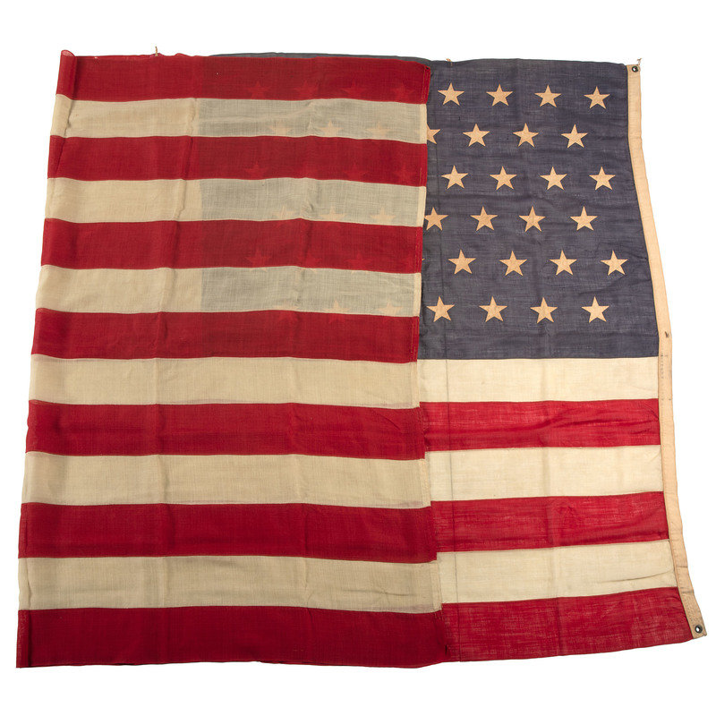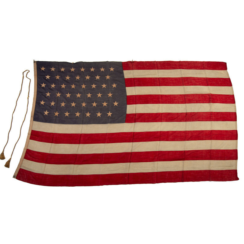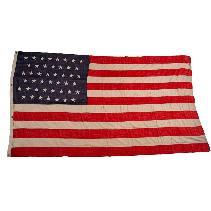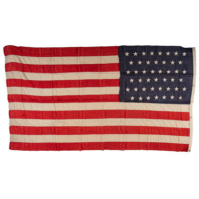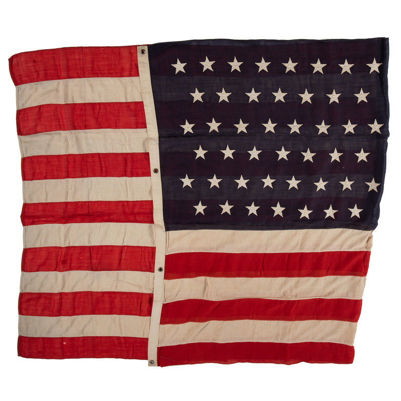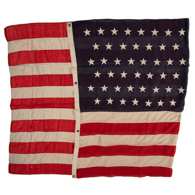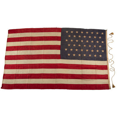 70 1/2 x 115 in. wool flag with 45 machine-sewn, double-appliqued cotton stars in 8-7-8-7-8-7 pattern. Cotton hoist with two brass grommets and one eyelet, with stitched label identified to "G.H. Launier." (Toning, some light soiling, few repaired edges, few small scattered holes throughout). Accompanied by gold chord.