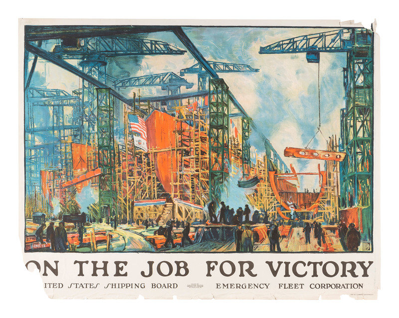 [WORLD WAR I]. LIE, Jonas, artist. On the Job for Victory / United States Shipping Board / Emergency Fleet Corporation. New York: The W.F. Powers Co. Litho., [ca 1918].