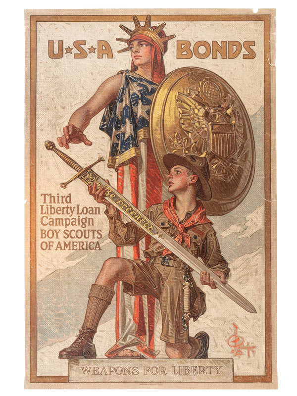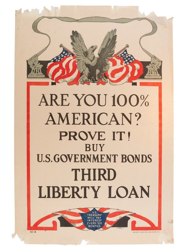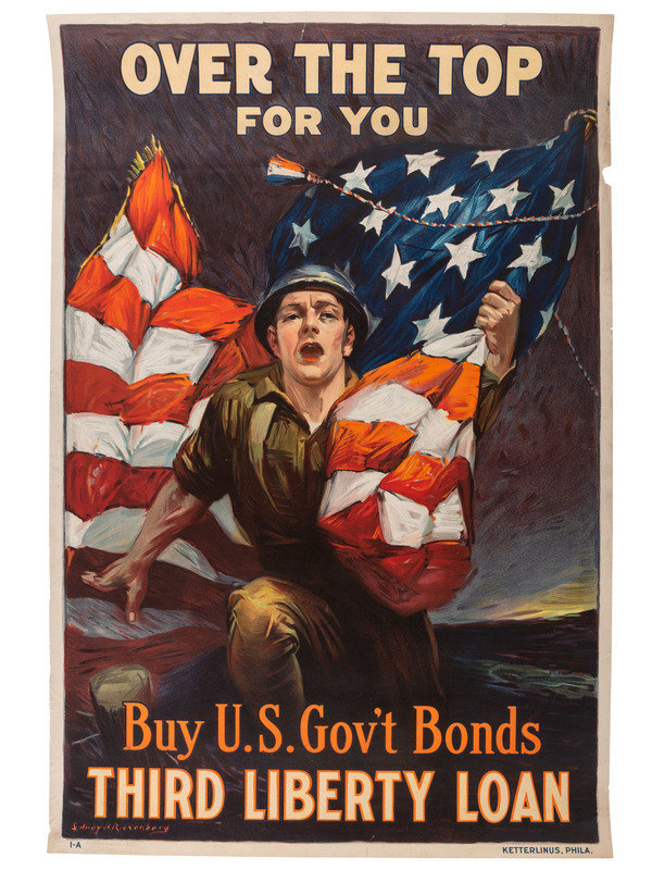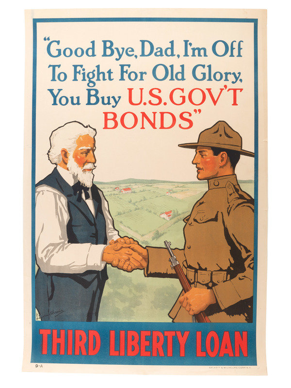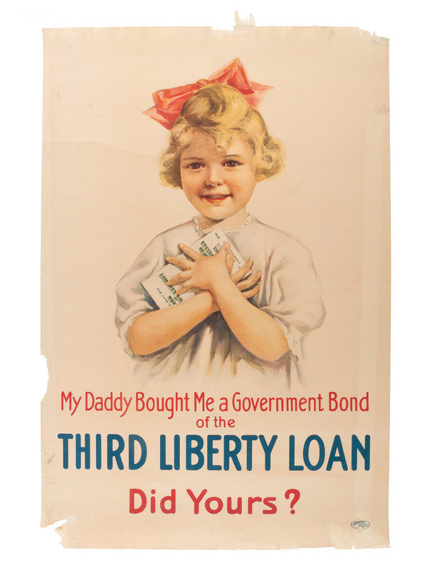 My Daddy Bought me a Government Bond of the Third Liberty Loan / Did Yours? New York: The United States Lithograph Co., 1917. "11-A" printed lower left. -- STERN, artist. Are You 100% American? Prove it! Buy U.S. Government Bonds / Third Liberty Loan. New York: Sackett & Wilhelms Corp., 1918. "10-A" printed lower left. -- LEYENDECKER, J.C., artist. USA Bonds / Third Liberty Loan Campaign / Boy Scouts of America / Weapons for Liberty. New York: American Lithographic Co., 1918. -- RIESENBERG, Sidney H., artist. Over The Top For You / Buy U.S. Gov' t Bonds / Third Liberty Loan. Philadelphia: Ketterlinus, 1918. "1-A" printed lower left. -- HARRIS, Lawrence, artist. "Good Bye, Dad, I'm Off To Fight For Old Glory, You Buy U.S. Gov't Bonds" / Third Liberty Loan. New York: Sackett & Wilhelms Corp., 1918. "9-A" printed lower left. -- Together, 5 posters, each approx. 20 x 30 in. Conditions vary, though most have light to moderate/heavy ripping and tearing to edges and corners, with paper loss in some areas, especially "My Daddy Bought Me a Government Bond" and "Are You 100% American?"