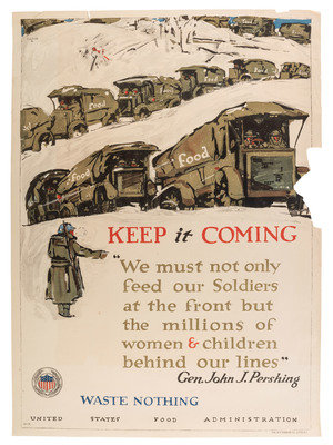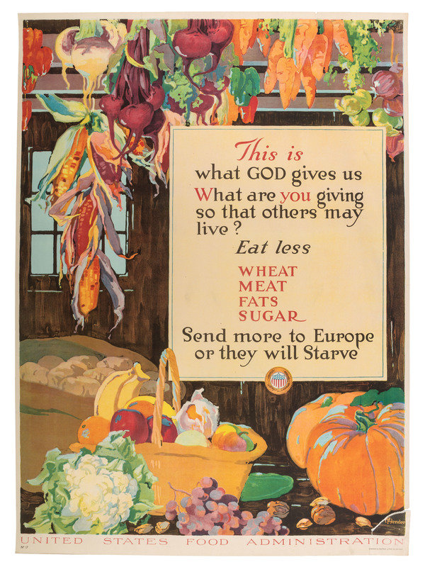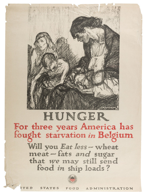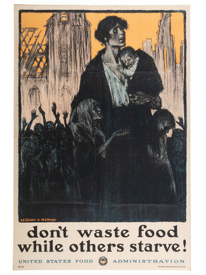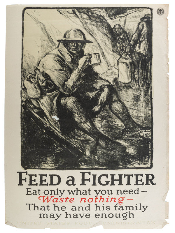 MORGAN, Wallace, artist. Feed a Fighter / Eat Only what You Need - / Waste Nothing - / That He and his Family May Have Enough. Cincinnati and New York: The Strobridge Lith. Co., 1918. "No. 15" printed lower left. -- HENDEE, A., artist. This Is What God Gives Us / What Are You Giving So That Others May Live? / East Less Wheat, Meat, Fats, Sugar / Send more to Europe or they will Starve. Chicago: Edwards & Deutsch Litho Co., 1917. "No. 17" printed lower left. -- ILLION, artist. Keep it Coming / "We must not only feed our soldiers at the front but the millions of women & children behind our lines" Gen. John J. Pershing / Waste Nothing. New York: The W.F. Powers Co. Litho, 1918. "No. 14" printed lower left. --RALEIGH, Henry, artist. Hunger / For three years America has fought starvation in Belgium. Chicago: Edwards & Deutsch Litho. Co., 1918. "No. 12" printed lower left. --CLINKER, L.C. and M.J. DWYER, artists. Don't Waste Food While Others Starve! New York: Heywood Strasser & Voigt Litho. Co., 1917. "No. 31" printed lower left. -- Together, 5 posters, each approx. 21 x 29 or smaller. Conditions vary, though most have some moderate ripping and tearing extending from edges and corners including paper loss in some cases (Keep it Coming with significant loss to right edge), few with pinholes and discoloration to edges.
