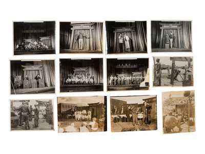 This lot contains 27 photographs, most black-and-white and taken with a civilian camera. The images of the production Walsh has labeled on verso. There is another group with no identification, including some of Korean girls and women. There are also a couple that seem to have been taken by someone in the Army whose job was photography.