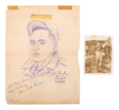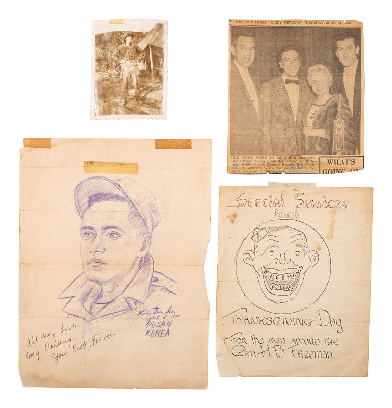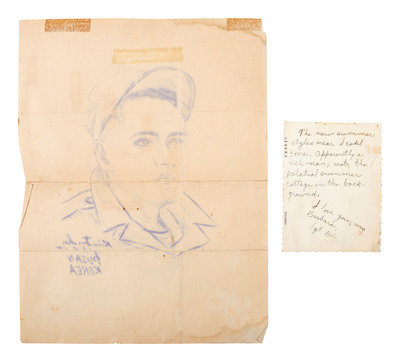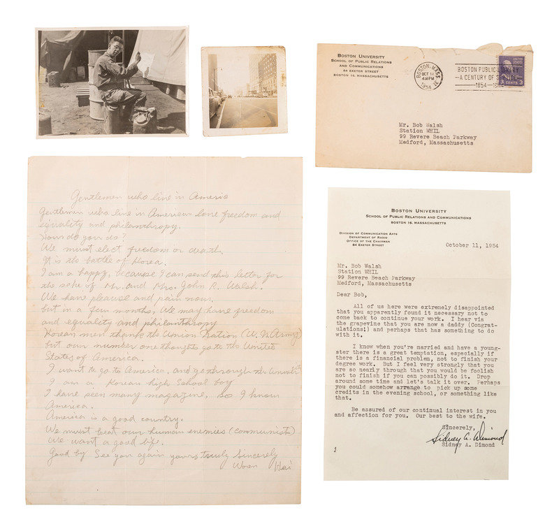 There are some other miscellaneous items, such as a customs tag from Korea declaring the enclosed items to be bona fide gifts. It also includes a lettersheet with a list of things that are good about America. Near the end: “I am a Korean high school boys. I have seen many magazine., so I know America. America is a good country. We must beat our human enemies (Communists). We want a good life.” It also includes a pencil sketch of Walsh by another Korean. Plus some newspaper clippings that give context to these items.