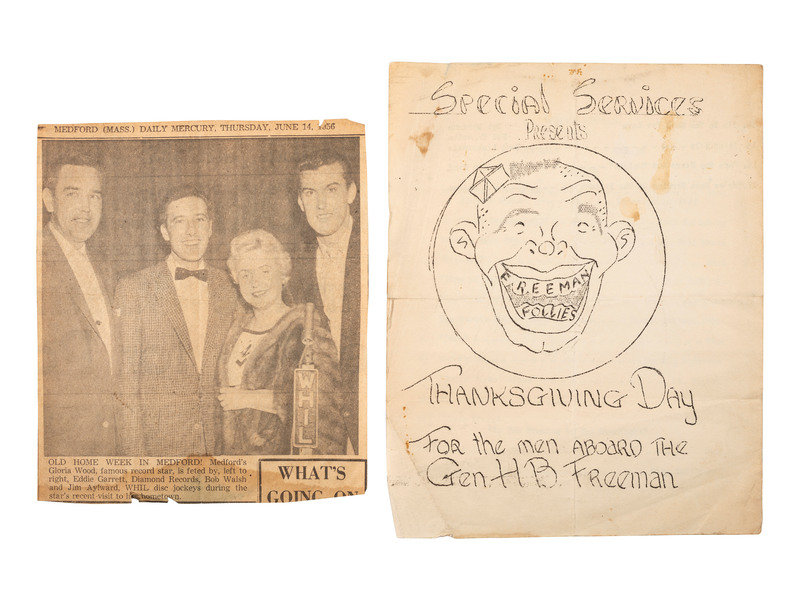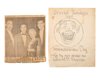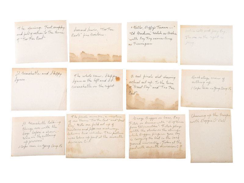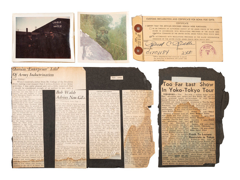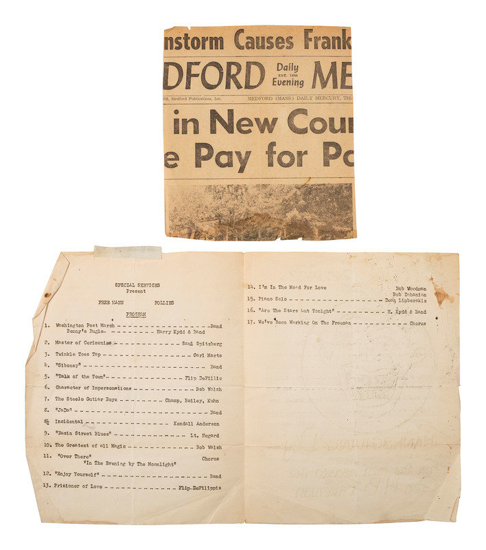 This unit produced a “variety review” they called “Too Far East,” which included original music by 1st Lieut. Art Keeney, who was also the director of the show. As one of the newspaper clippings in the lot notes: "Although the Sons of the Nipponeers, a western group organized for the show, and the Sackrats, the ‘Too Far East’ band, are both making their debut, others are old-timers in show business. Among them are comics Ray Fry and Vince Drankwalter, Bobby Mosley, the show’s ‘boy with a million-dollar voice,’ and Bob Walsh, MC and impersonator of well-known entertainers.”
