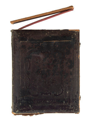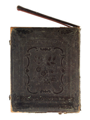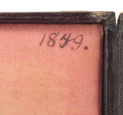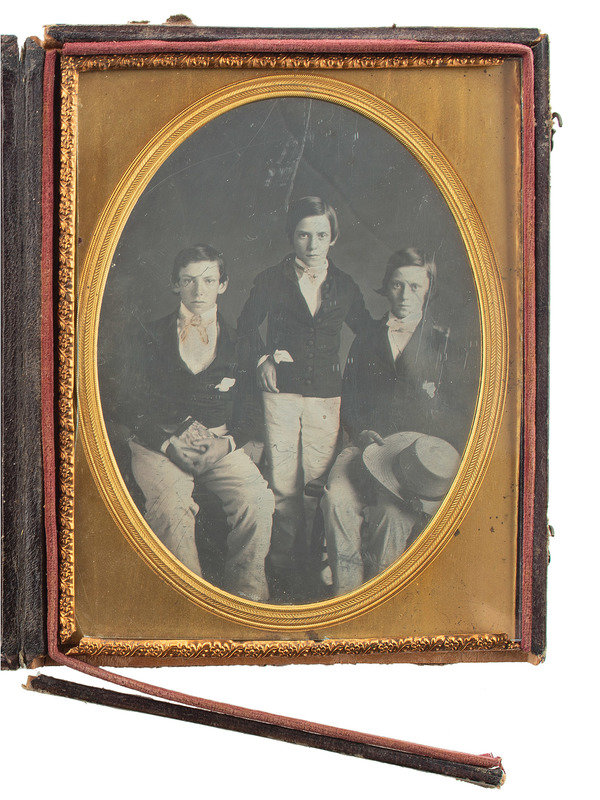 Half plate daguerreotype of three sharply dressed boys, likely brothers. (Several stray scratches, but overall very good.) Housed in floral pressed paper case (lower edge partially detached, heavy wear). Pad dated "1849."