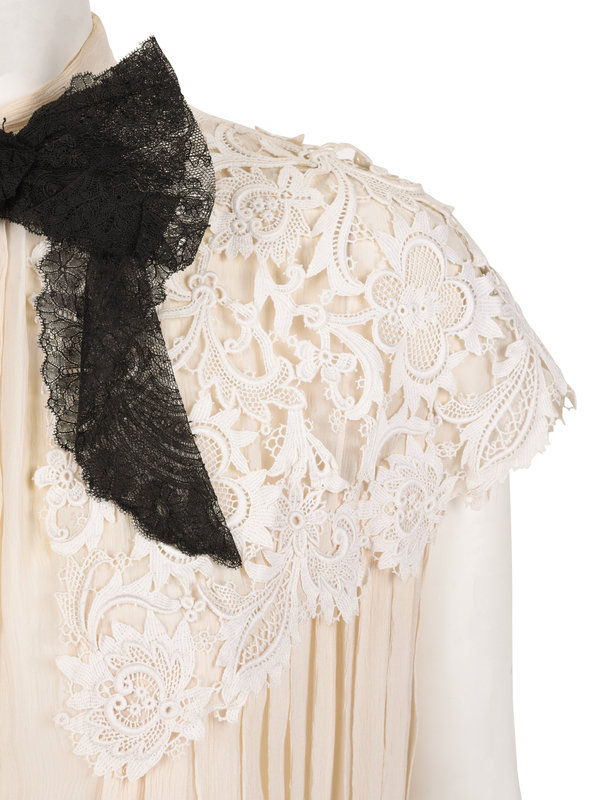 Cream silk crepe pleated cap sleeve top with top lace yoke, black lace bow on the front neckline, pleated lower bodice, and center front button closure.