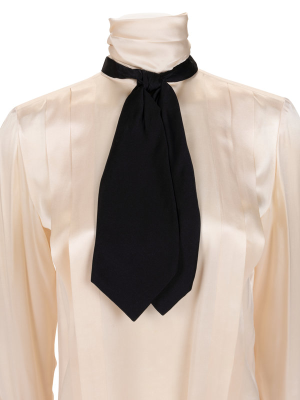 Haute Couture cream silk satin blouse with black satin attached necktie detail, front pleats, French cuffed long sleeves with gold thread knotted cufflinks, and center back hidden button closure.