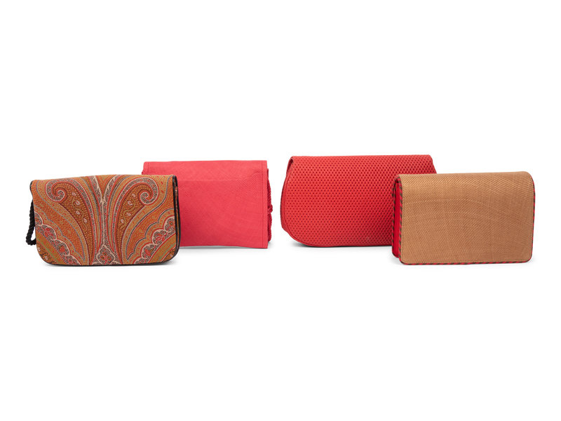 Red envelope bag with a braided double cord strap, a grey and red beaded front button detail, and a snap closure.