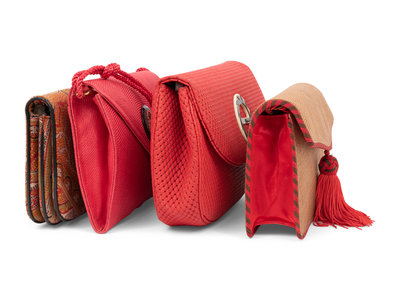 Tan ribbed weave envelope bag with red and green twisted cord shoulder strap, matching trim, and a large red tassel in the front with snap closure.