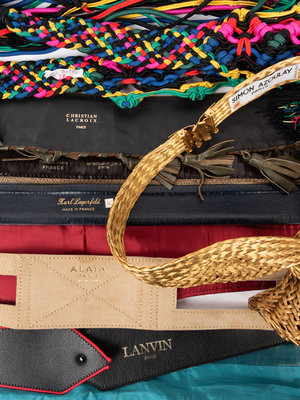 Brown, black, and gold woven belt with gold and green braided trim and a large gold-tone buckle.