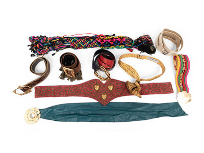 Multihued braided striped belt with gold lettering and star chain half attached and a large gold circular buckle made from smaller circles.