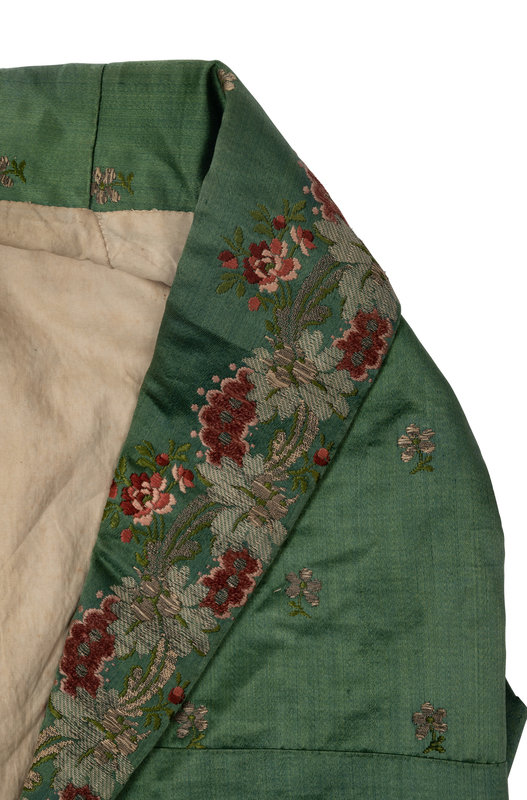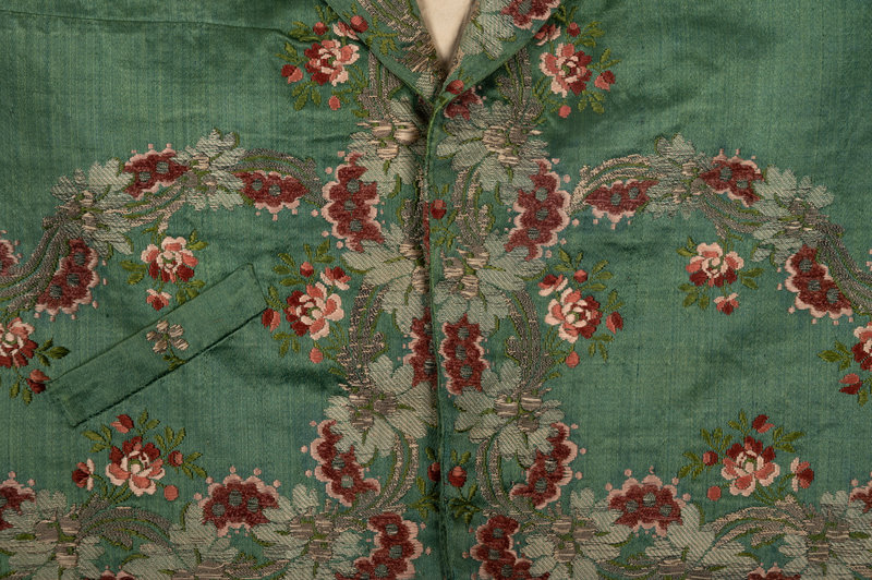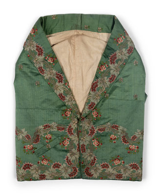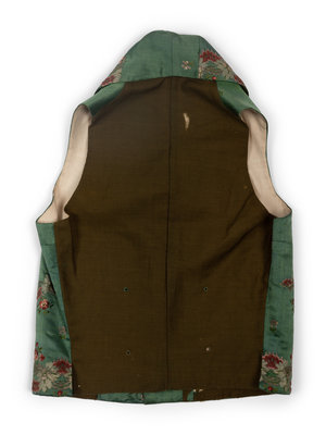 Men's green silk waistcoat with metallic and silk thread brocade pattern around the shawl collar, center front, hems and pockets. The waistcoat is lined in cream cotton and backed in green wool, which has eyelets for cinching the waistline (the original lacing is missing).