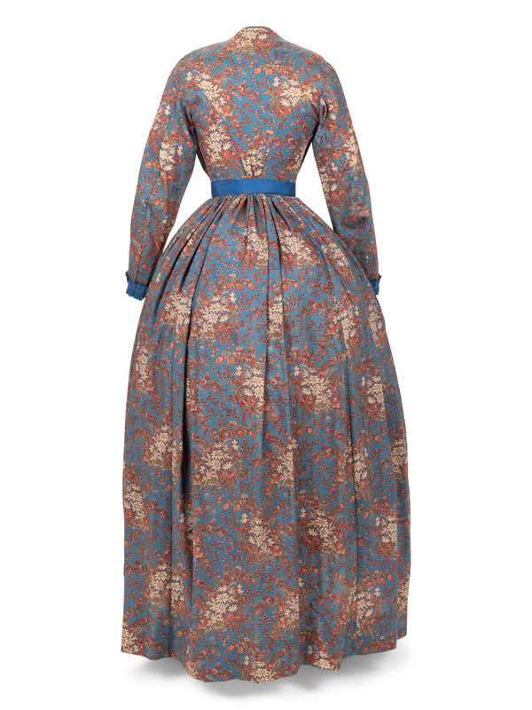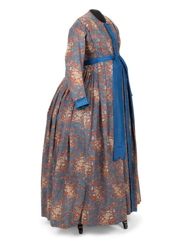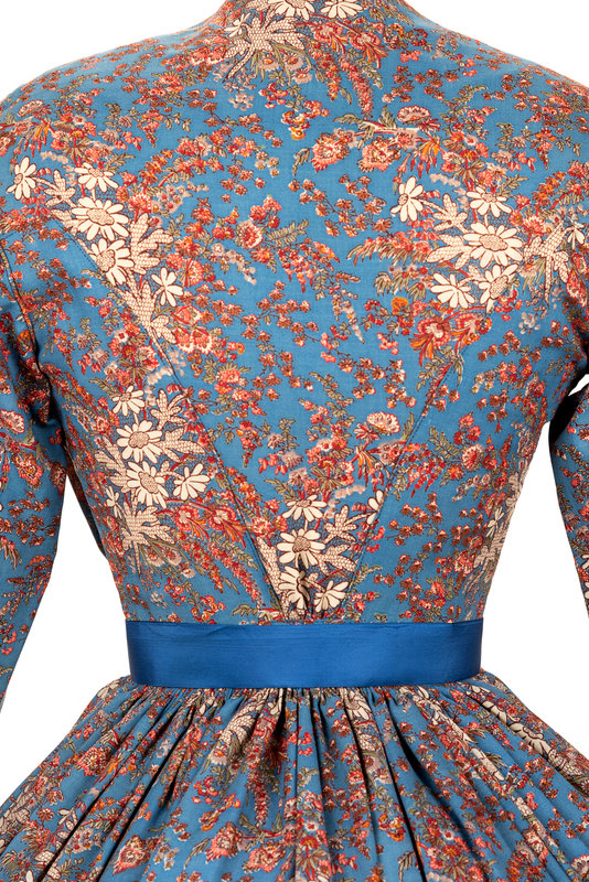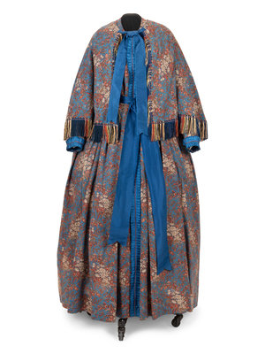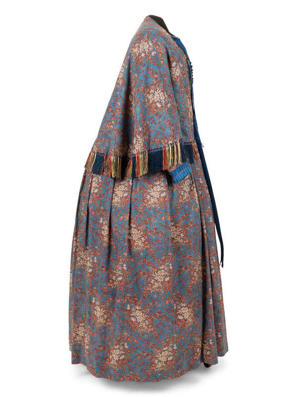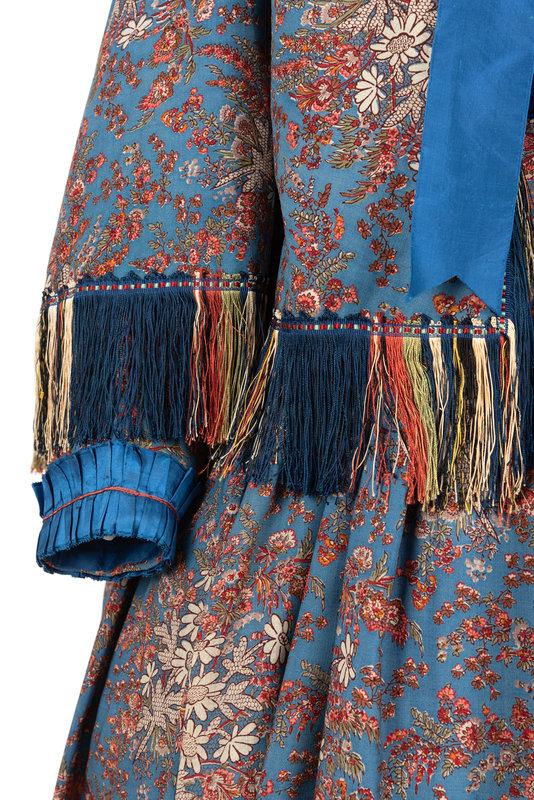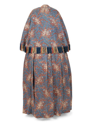 The dress and cape are made of blue printed fabric in a floral pattern in whites and reds. Both pieces are trimmed with blue silk satin ribbon and the cape is further trimmed with silk fringe in matching colors to the fabric.