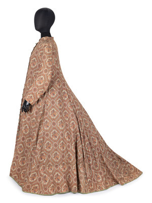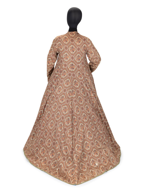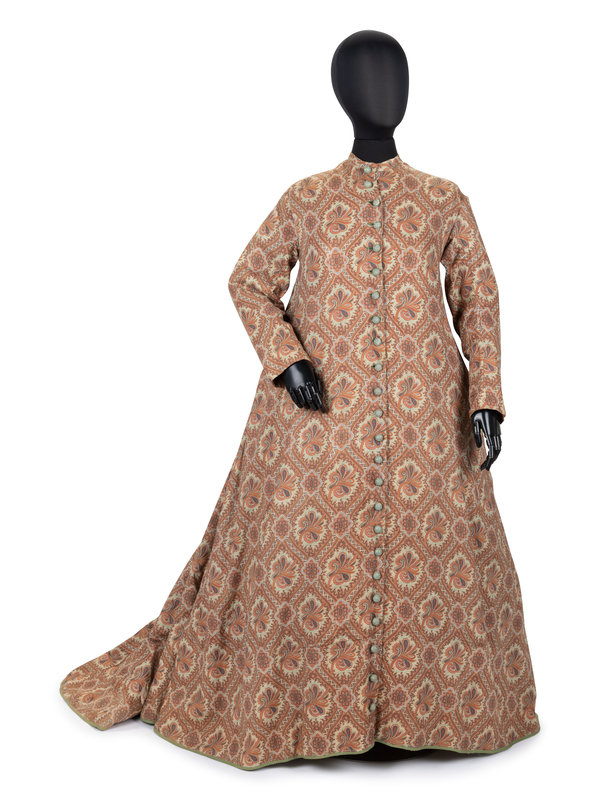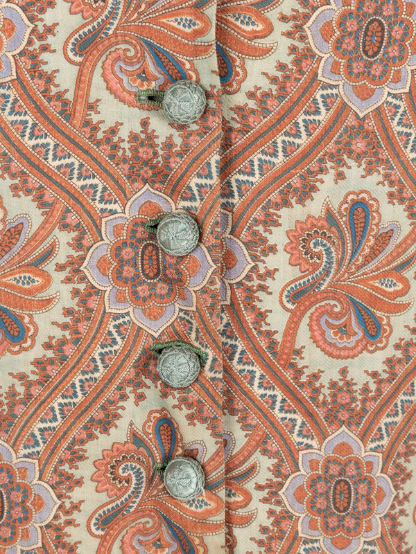 This wrapper or house coat is made of a printed material in a paisley pattern in light green, blue, red and white. The center front opens with worked buttons in silk thread and the garment is lined with green silk.