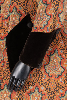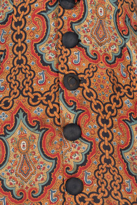 Coat made out of printed wool in a paisley and chain pattern in reds blue, black and white. The center front is closed with buttons in black velvet while the pocket flaps and sleeve cuffs are in brown.