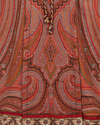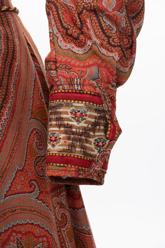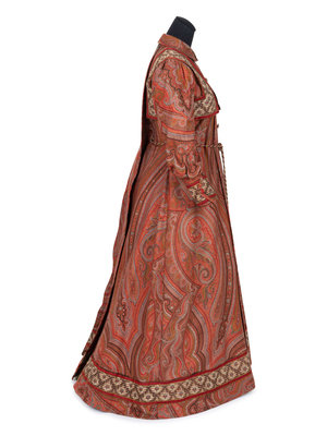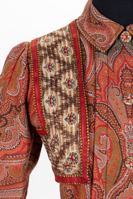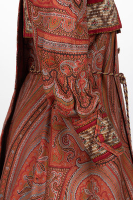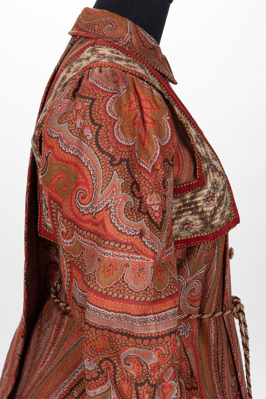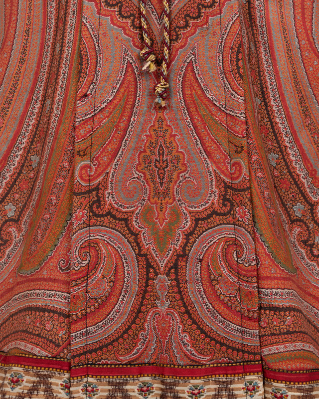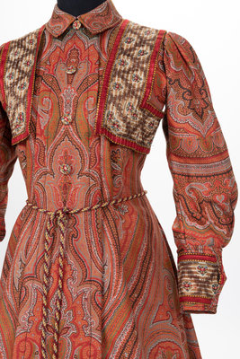 Large woven and embroidered paisley shawls were popular accessories throughout most of the 19th century. As they started to go out of fashion, the rich textiles of these shawls were often used to create wall hangings or were cut into pillows or garments, as in the case of this c.1890 house dress.