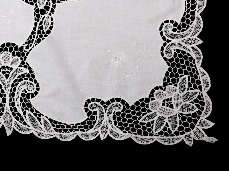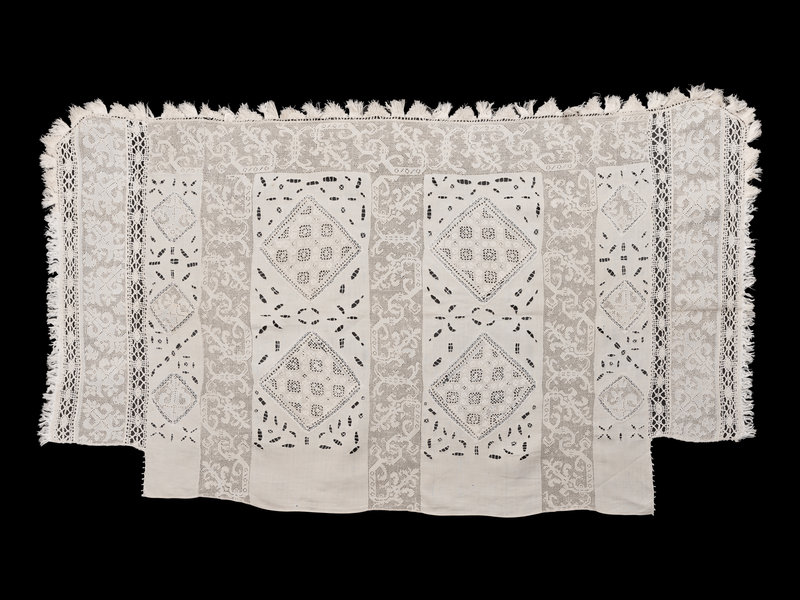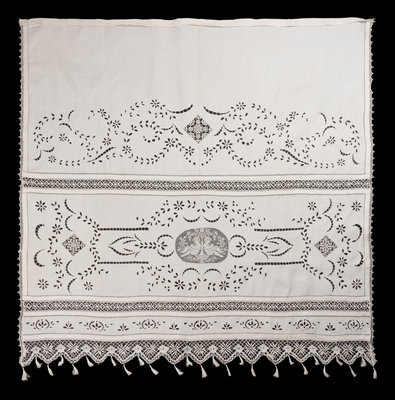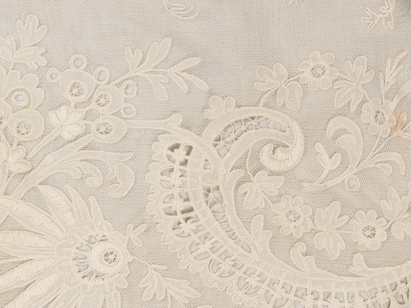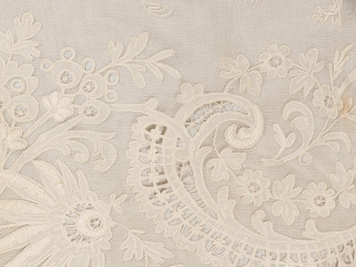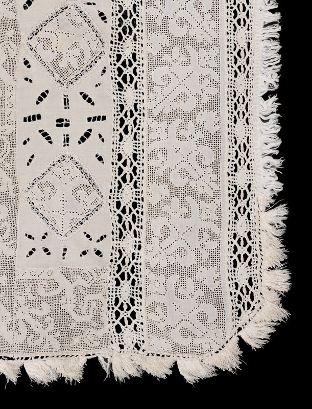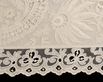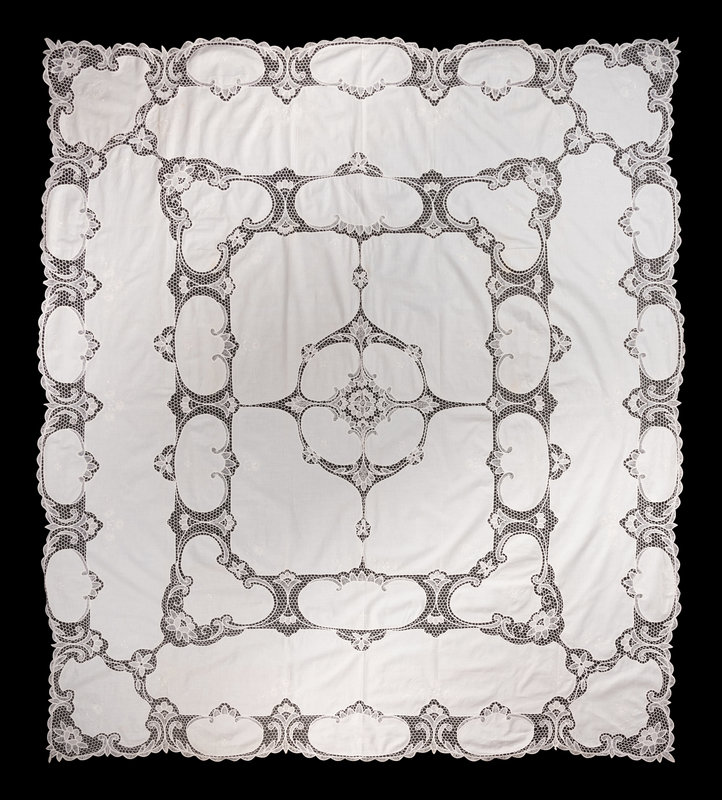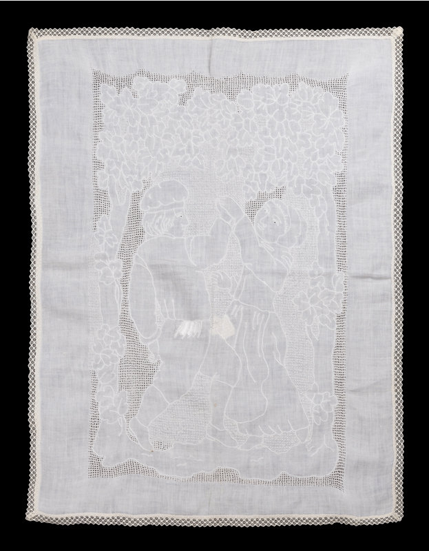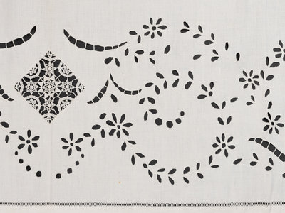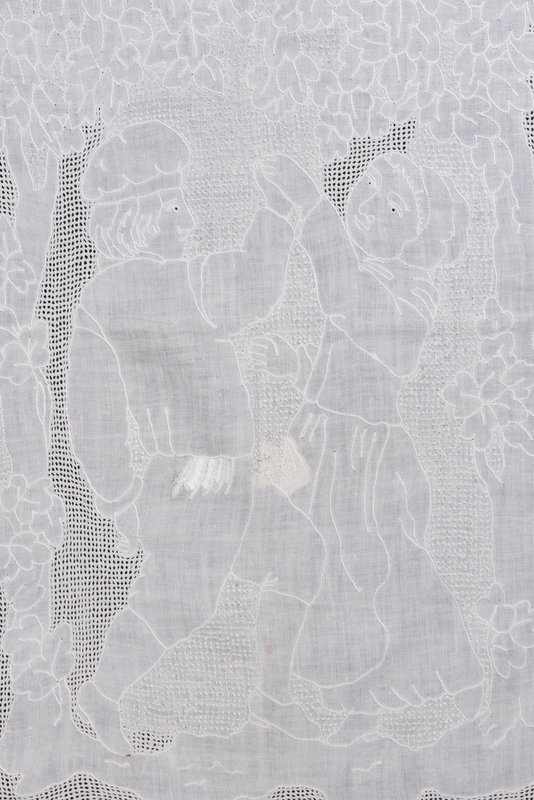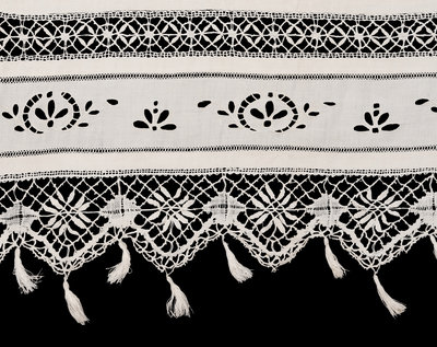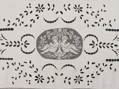 Large linen and cotton applique lace panel with cherub motif and tassels and top button holes.