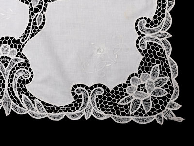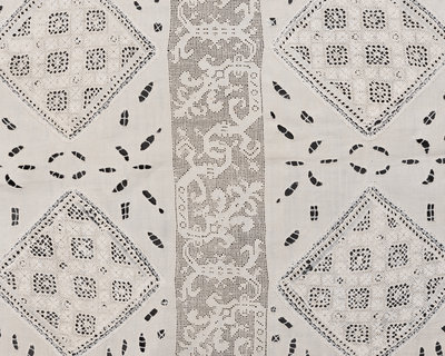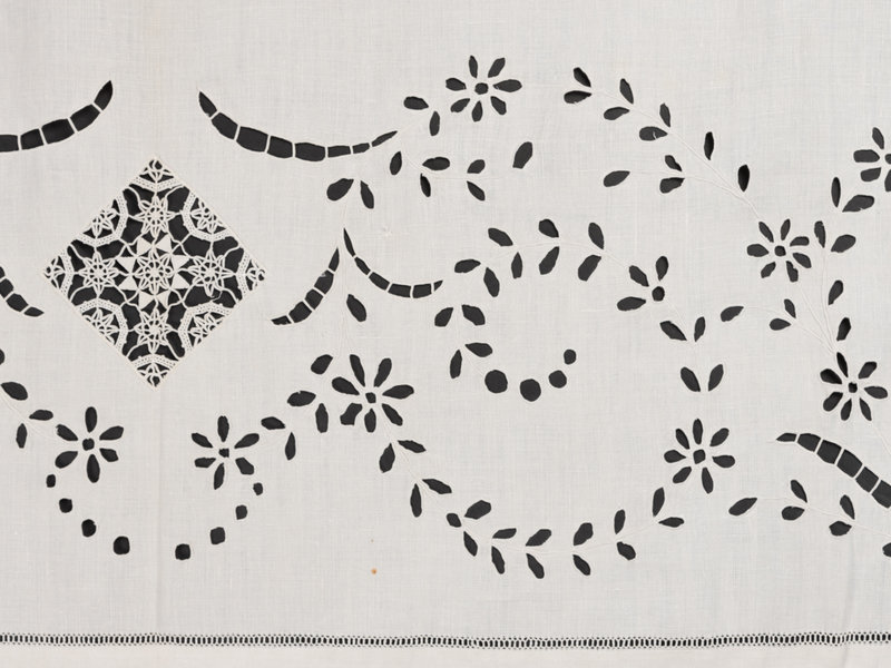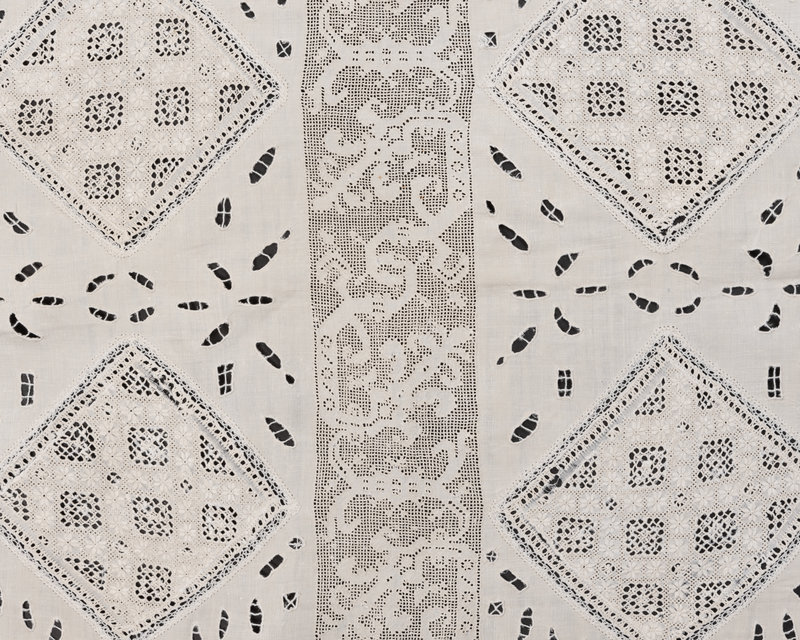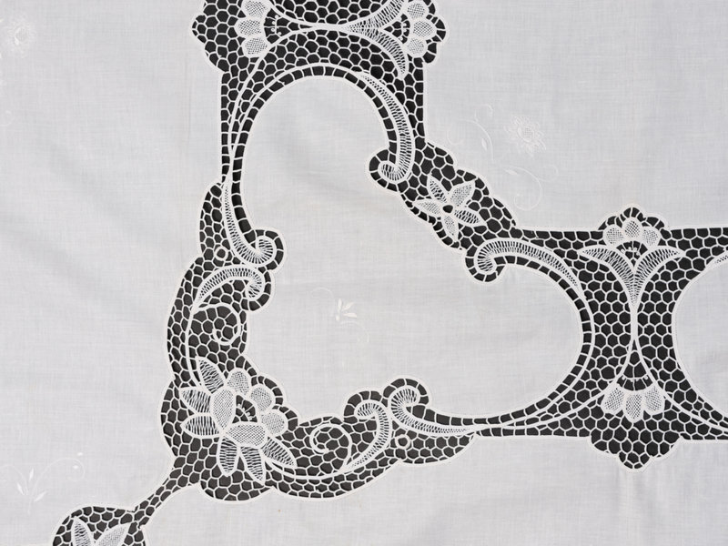 A pair of white cotton floral motif net lace pillow shams backed in cotton lawn.
