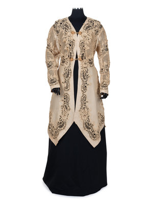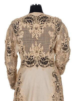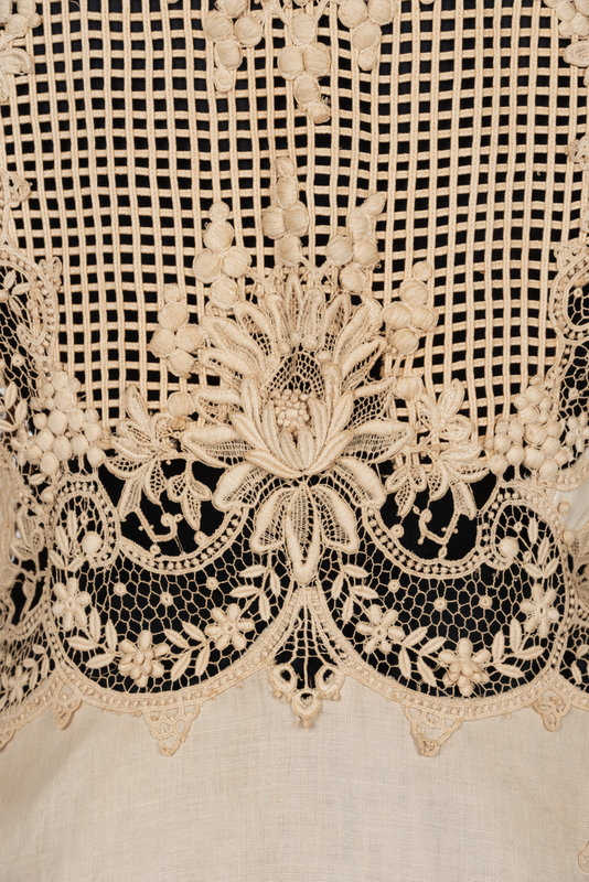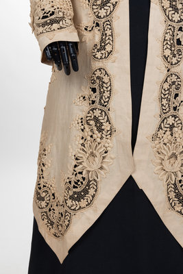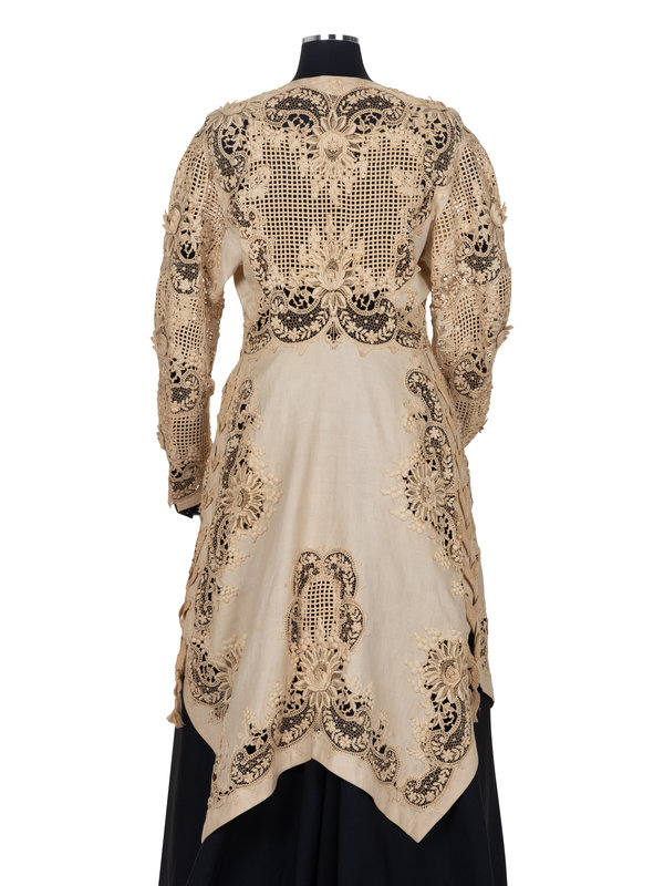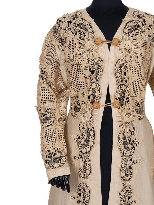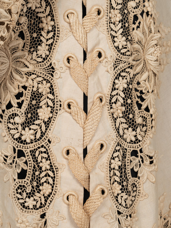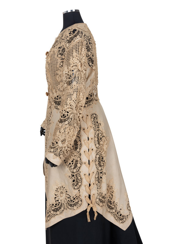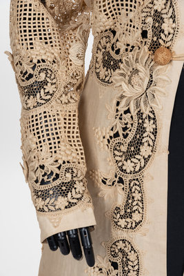 Cream silk lace jacket cut in the popular s-curve silhouette of the early twentieth century and trimmed with cut-out panels of lace, crochet and embroidery.