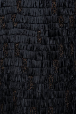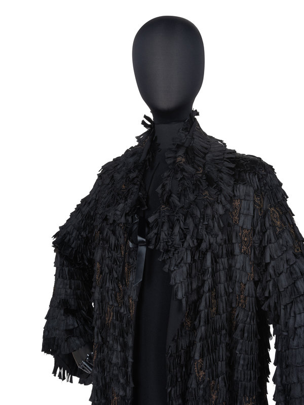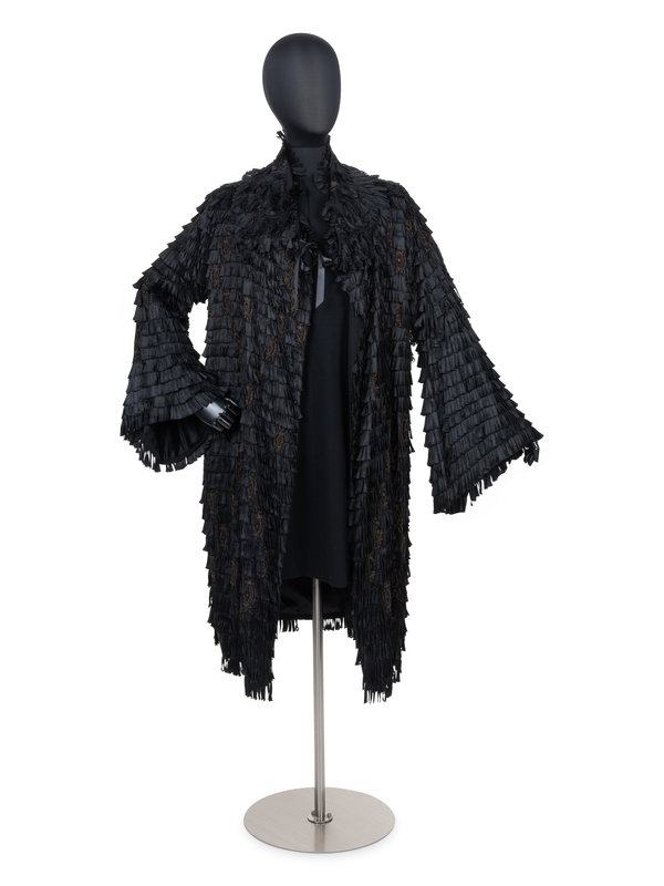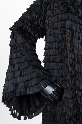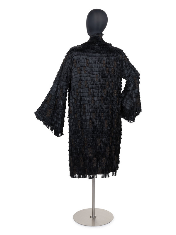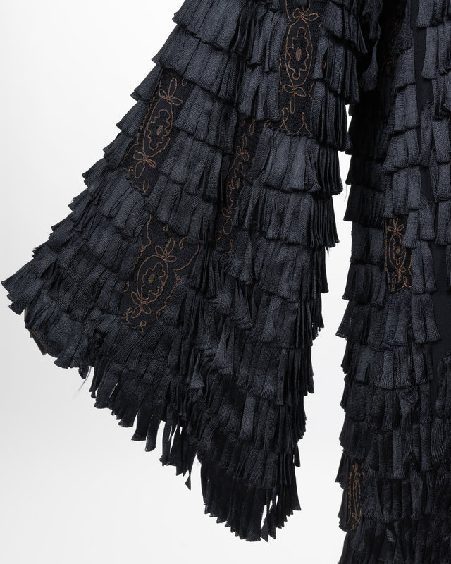 Evening coat made of black silk ribbons sewn to the exterior of the coat and embellished with gold metallic thread. The jacket is finished with a wide collar, long flared sleeves and is lined in black satin.
