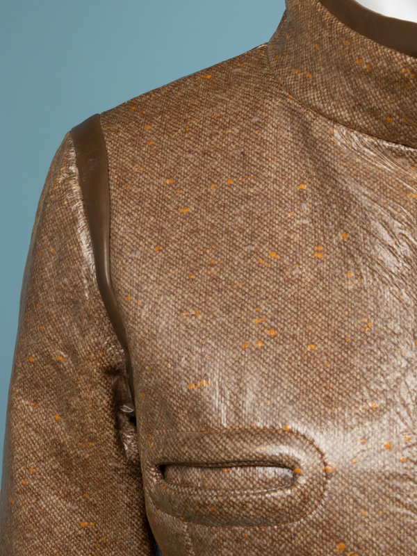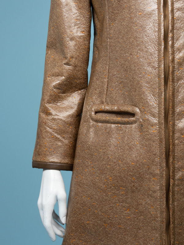 Brown wool tweed coat coated in clear vinyl with banded collar, fitted long sleeves, four front welts, and center front zipper closure.