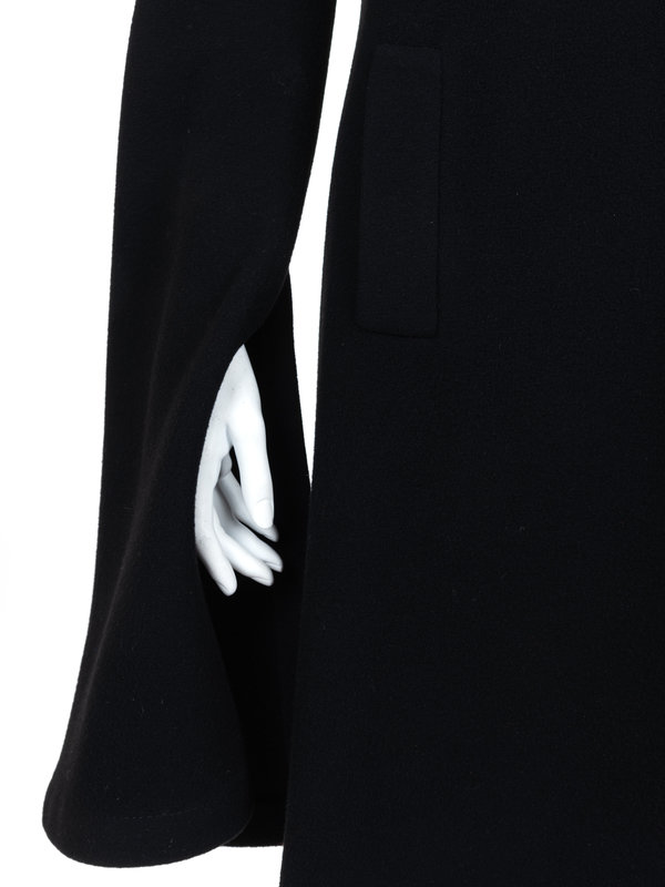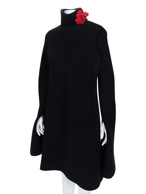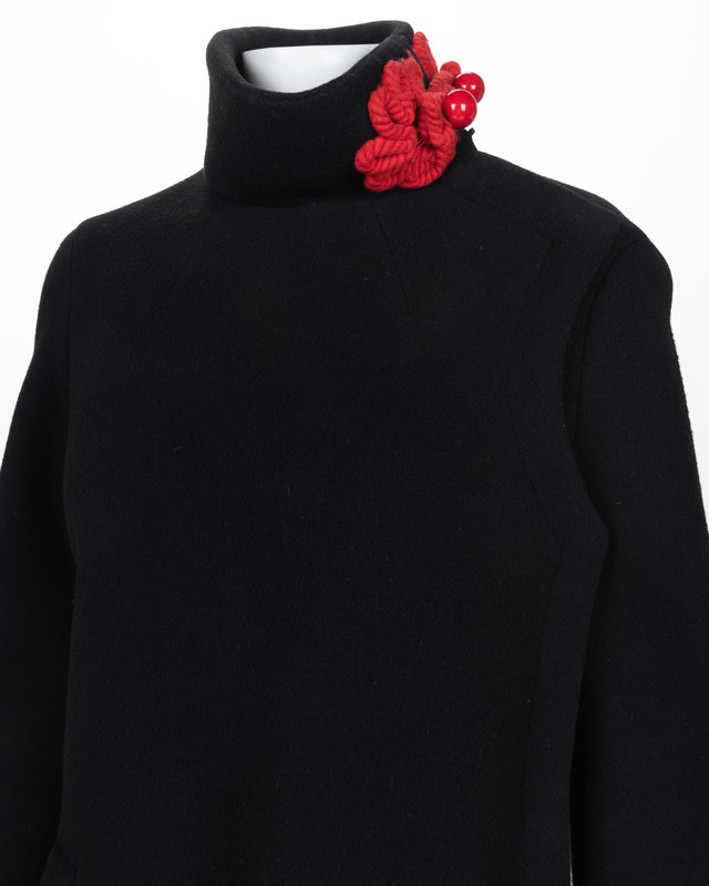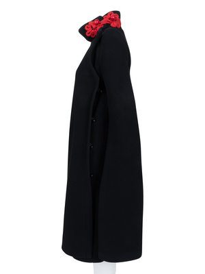 Black wool jacket with high collar with red yarn frog clasp with red buttons, extra long slit front sleeves, flared hem, and front left snap closure.