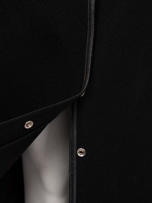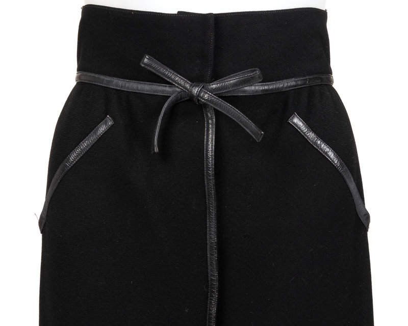 Black wool snap front skirt trimmed in black faux leather with bow detail.