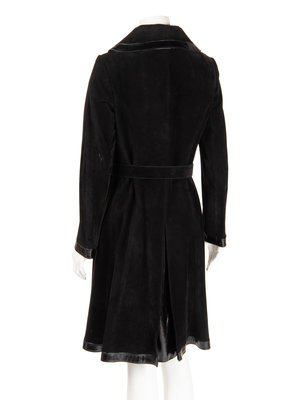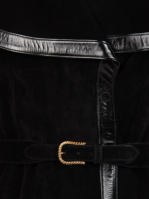 Black suede wrap style coat with scalloped leather trimmed collar, fitted long sleeves with leather cuffs, flared skirt, and front snap closure with buckled belt.