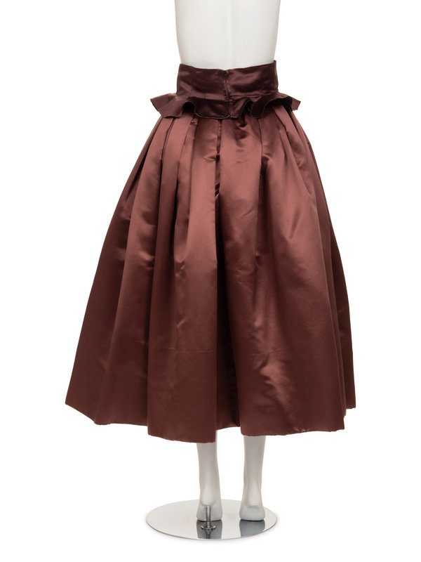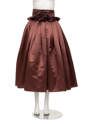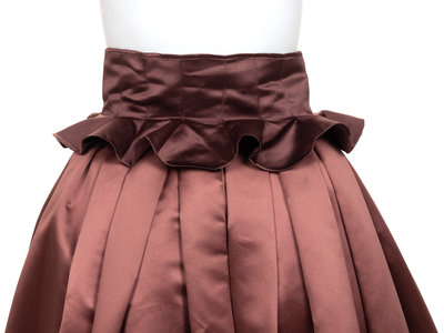 Mauve silk satin pleated full skirt with zipper closure; paired with a detachable dark mauve satin frilled belt/corselet.