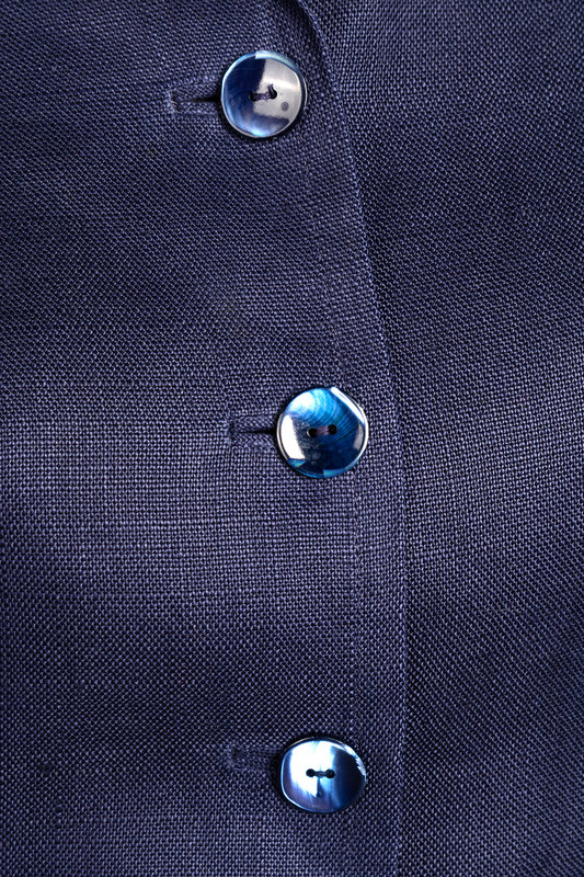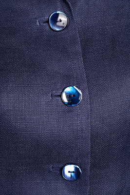 Blue linen blend two-piece skirt ensemble including a shirt top bodysuit with convertible collar, full gathered sleeves, and front button closure; paired with matching skirt with two front pockets and zipper closure.