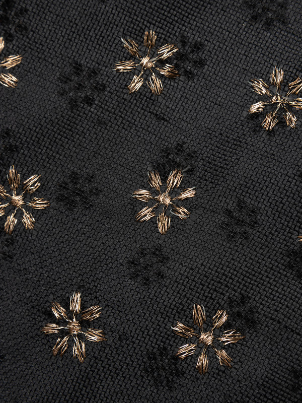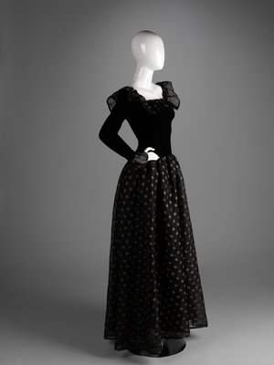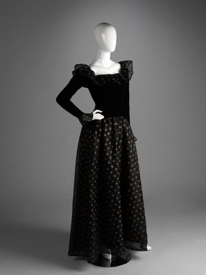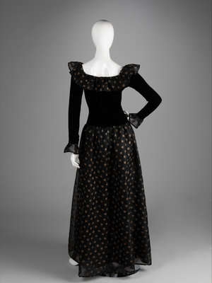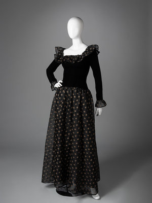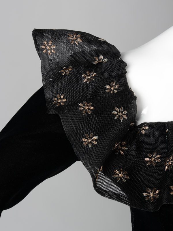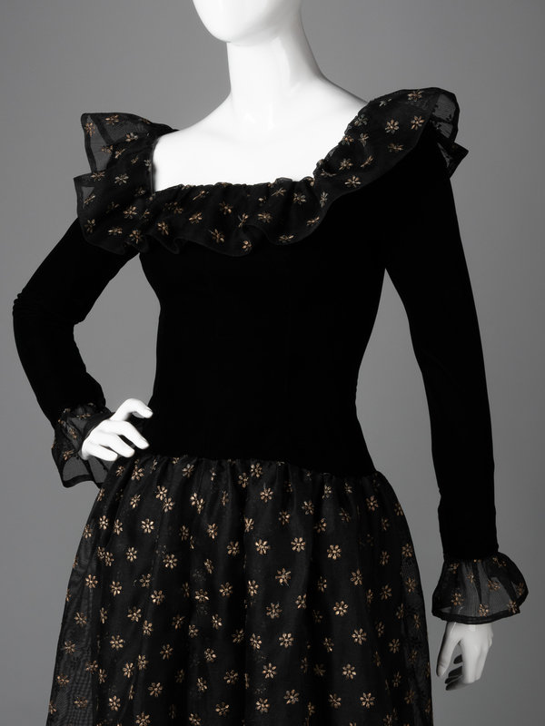 Haute Couture black silk and linen evening dress embroidered with a gold thread floral pattern, black velvet bodice with linen ruffled neckline, velvet long sleeves with linen ruffled cuffs, linen full gathered skirt, and center back zipper closure.