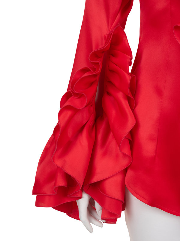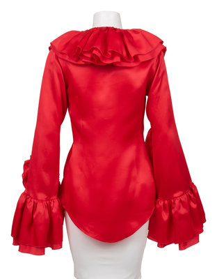 Red silk blouse with ruffled collar center front, and long sleeve hems.