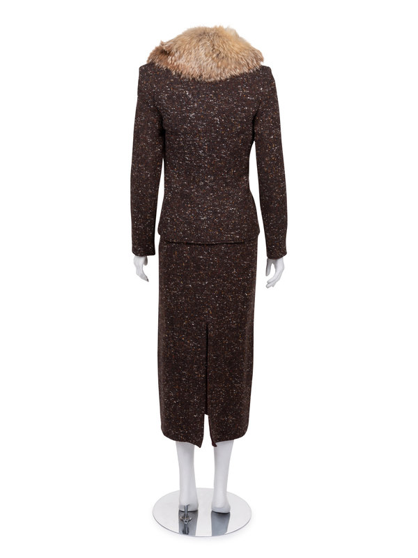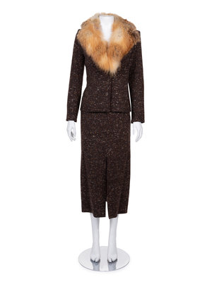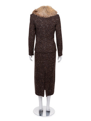 Brown wool blend tweed two-piece skirt ensemble including a detachable Reynard fox trimmed lapel jacket lined with brown sueded fabric, long sleeves, and front button closure; paired with matching straight fit skirt with front and back slit, and center back zipper closure.
