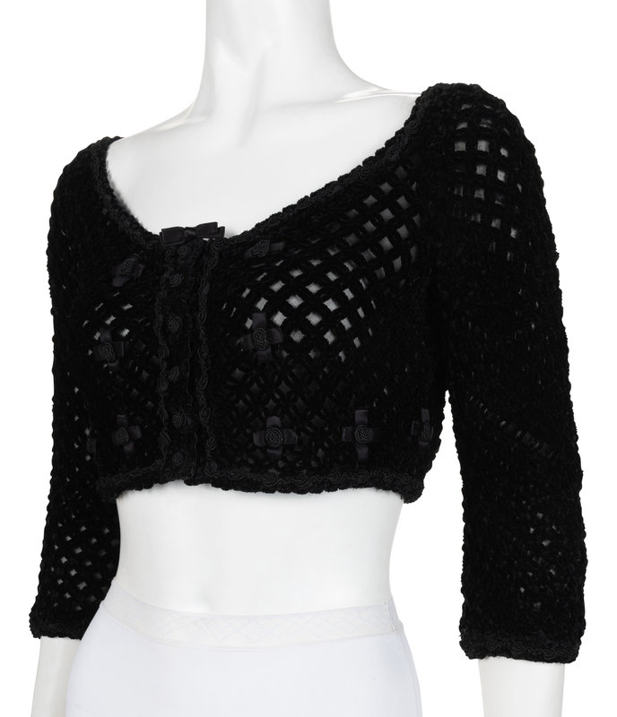 Black chenille yarn knit top lined in black silk crepe, and embellished with satin ribbon and cord rosettes.