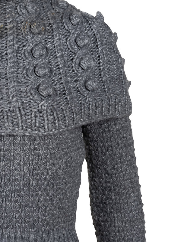 Gray wool/nylon blend cable knit cropped sweater with large turtle neck.