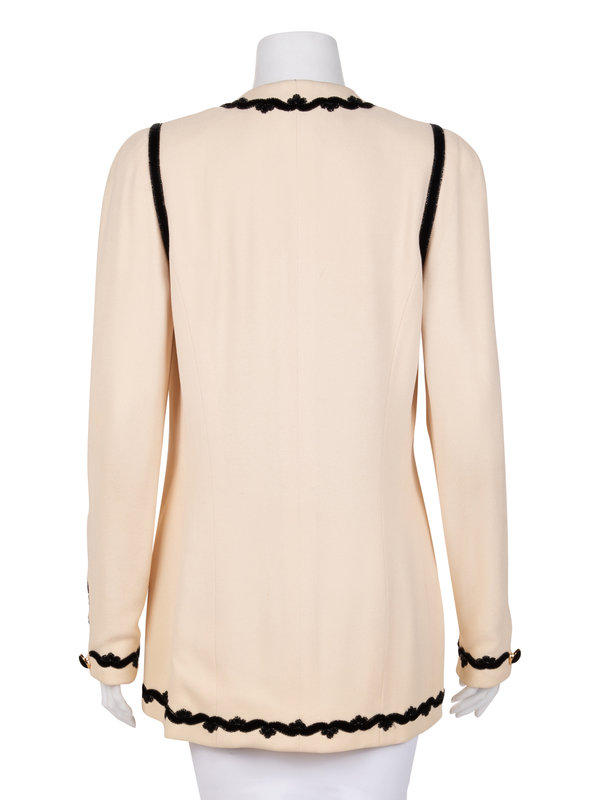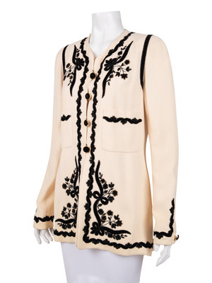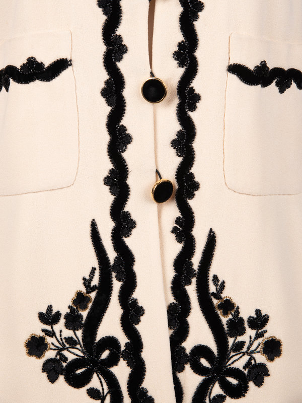 Ivory wool crepe cardigan style jacket with black velvet applique embellished with gold and black beads, long sleeves with buttoned plackets, and front button closure.