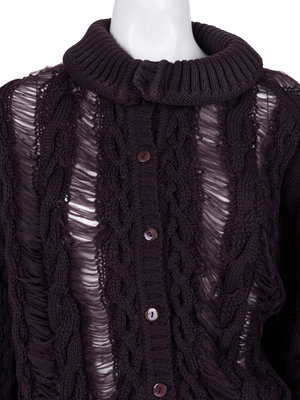 Dark purple nylon cable knit cardigan with funnel neckline, and net strand yarn detail.